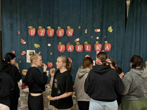 W dniu 28 września w naszym ośrodku odbyły się obchody „Dnia Jabłka” – wydarzenia promującego zdrowy styl życia, walory odżywcze jabłek oraz kreatywne sposoby ich wykorzystania. Celem przedsięwzięcia było nie tylko dostarczenie wiedzy na temat tego popularnego owocu, ale również integracja wychowanek poprzez wspólną zabawę, rywalizację i twórcze działania. Dzień rozpoczął się od krótkiej prezentacji multimedialnej. Prezentacja zawierała ciekawostki oraz kolorowe ilustracje, które wzbudziły zainteresowanie uczestniczek. Dziewczęta miały okazję dowiedzieć się, skąd pochodzą jabłka, jakie są ich odmiany, jakie wartości odżywcze zawierają oraz jakie znaczenie mają dla zdrowia człowieka. Po części edukacyjnej odbyła się degustacja produktów przygotowanych z jabłek. Wychowanki mogły spróbować m.in. szarlotki, musu jabłkowego, ciasteczek z jabłkami oraz chipsów jabłkowych i racuchów z jabłkami. Wszystkie potrawy zostały przygotowane wspólnie przez dziewczęta i wychowawców, co dodatkowo wpłynęło na integrację grupy. Następnie przeprowadzony został quiz, który sprawdzał wiedzę uczestniczek zdobytą podczas prezentacji, odbyła się konkurencja na najdłuższą obierkę z jabłka oraz konkurs na jedzenie jabłka Pytania dotyczyły historii jabłek, ich wartości odżywczych oraz ciekawostek na ich temat. Zwyciężczynie otrzymały drobne upominki. Kolejnym punktem programu były zajęcia plastyczne – dziewczęta w grupach przygotowywały plakaty promujące jedzenie jabłek. Prace odznaczały się dużą kreatywnością, a wykonane plakaty zostały wywieszone na terenie ośrodka. Nie zabrakło również elementu rywalizacji. W konkursie na najdłuższą obierkę jabłka liczyła się precyzja i cierpliwość. Zabawa wzbudziła wiele śmiechu i pozytywnych emocji. Ostatnią atrakcją dnia była konkurencja sprawnościowa – kto najszybciej zje jabłko bez użycia rąk. Wychowanki z dużym zaangażowaniem podeszły do zadania, a doping koleżanek dodawał energii zawodniczkom. „Dzień Jabłka” był nie tylko okazją do wspólnej zabawy, ale również do zdobycia wiedzy oraz promowania zdrowego odżywiania. Dzięki zaangażowaniu wychowanek i wychowawców, wydarzenie przebiegło w miłej, radosnej atmosferze i z pewnością na długo pozostanie w pamięci uczestniczek. Joanna Drużna
